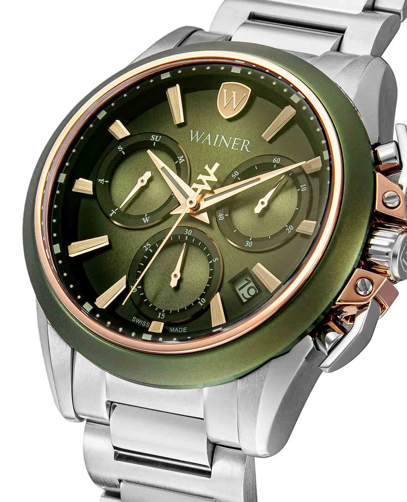 Швейцарские мужские кварцевые часы-хронограф Wainer WA.16100-A с механизмом калибра Ronda 5030.D станут идеальным выбором для ценителей стильных и практичных аксессуаров. Корпус из нержавеющей стали 316L с частичным PVD-покрытиемPVDУльтратонкое покрытие наносится в технике вакуумного напыления, сочетает в себе нитрид титана особой прочности со слоем золота или оксида хрома. Несёт в себе декоративную или защитную функцию. диаметром 44 мм и толщиной 11 мм защищен прочным сапфировым стекломСапфировое стеклоПрочный и надёжный материал из кристалла сапфира синтетического происхождения, характеризующийся особой твёрдостью и устойчивостью к царапинам и повреждениям., устойчивым к царапинам и механическим повреждениям. Зеленый циферблат с метками в виде штрихов оснащен окошком даты между 4 и 5 часами, а указатель дня недели вынесен на отдельный циферблат. Рифленая заводная головка с защитой обеспечивает дополнительную надежность механизма. Модель имеет класс водозащиты 100 метров, позволит плавать, нырять и заниматься другими водными видами спорта. Часы комплектуются стальным браслетом из нержавеющей стали 316L на раскладной застёжкеРаскладная застёжкаТакой тип застёжки используется только на браслетах из металла. Она никогда не раскрывается полностью, происходит разделение на 2 и более частей. Раскладывающая застёжка снизит вероятность потери часов к минимуму.. Функциональные возможности включают хронограф, секундомер и вынесенную секундную стрелку. Модель станет превосходным выбором для мужчин, ценящих надежность швейцарского качества и современный дизайн.