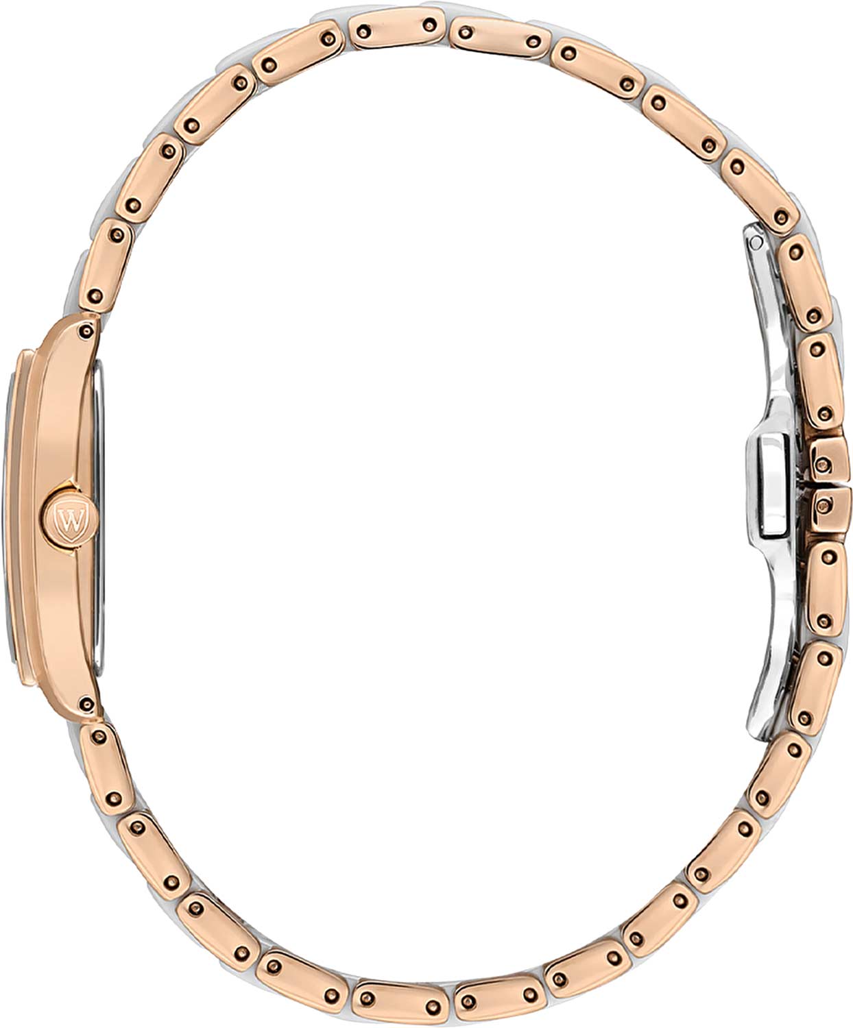 Швейцарские женские кварцевые часы Wainer WA.18060-C станут элегантным дополнением любого образа. Прямоугольный корпус из нержавеющей стали 316L размером 22х24.5 мм и толщиной 8 мм защищен прочным сапфировым стекломСапфировое стеклоПрочный и надёжный материал из кристалла сапфира синтетического происхождения, характеризующийся особой твёрдостью и устойчивостью к царапинам и повреждениям.. Циферблат с метками в виде штрихов украшен кристаллом в положении 12 часов, а заводная головка с фирменным логотипом добавляет модели особый шарм. Часы имеют класс водозащиты 30 метров, позволит защитить корпус от случайных брызг или капель дождя. Модель комплектуется стальным браслетом из нержавеющей стали 316L с керамическими вставками на раскладной застёжкеРаскладная застёжкаТакой тип застёжки используется только на браслетах из металла. Она никогда не раскрывается полностью, происходит разделение на 2 и более частей. Раскладывающая застёжка снизит вероятность потери часов к минимуму., длина браслета составляет 180 мм. Вес часов 88 грамм обеспечивает комфортное ношение в течение дня. Элегантный дизайн и надежное качество швейцарского производства делают эти часы превосходным выбором для современной женщины.