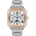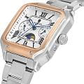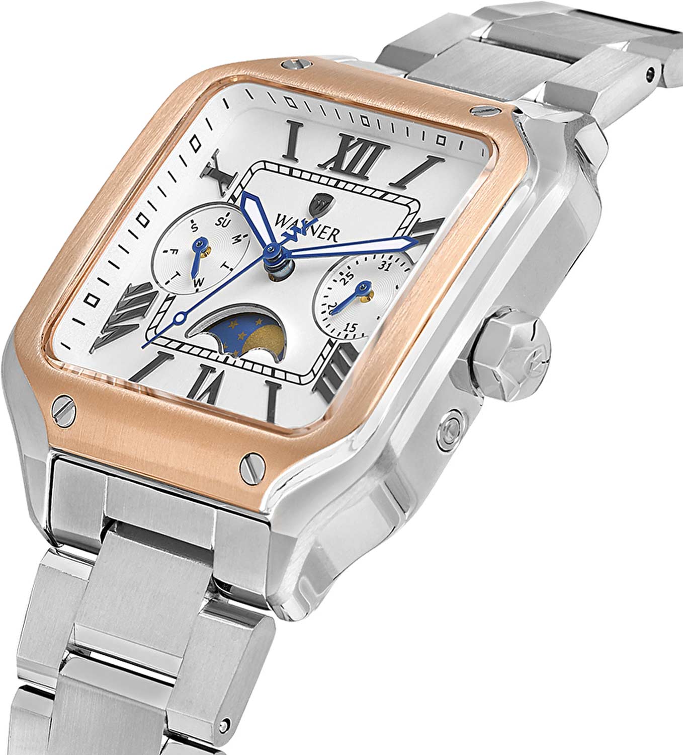 Женские кварцевые часы Wainer WA.18091-E — это стильный аксессуар, сочетающий в себе швейцарское качество и изысканный дизайн. Модель выполнена в квадратной форме из стали 316L с частичным PVD-покрытиемPVDУльтратонкое покрытие наносится в технике вакуумного напыления, сочетает в себе нитрид титана особой прочности со слоем золота или оксида хрома. Несёт в себе декоративную или защитную функцию. розового цвета, что придаёт ей благородный внешний вид и устойчивость к царапинам. Корпус украшен декоративными винтами, подчёркивая внимание к деталям. Циферблат белого цвета дополнен штриховыми метками и римскими цифрами, а секундная стрелка на конце декорирована буквой W, добавляя модели индивидуальности. Число, день недели и индикатор фазы Луны вынесены на отдельные циферблаты, что делает её функциональной и выразительной. Защиту механизма обеспечивает сапфировое стеклоСапфировое стеклоПрочный и надёжный материал из кристалла сапфира синтетического происхождения, характеризующийся особой твёрдостью и устойчивостью к царапинам и повреждениям., устойчивое к повреждениям. Гранёная заводная головка с защитой оснащена фирменным логотипом, а браслет из стали 316L шириной 16 мм оснащён Раскладная застёжкаРаскладная застёжкаТакой тип застёжки используется только на браслетах из металла. Она никогда не раскрывается полностью, происходит разделение на 2 и более частей. Раскладывающая застёжка снизит вероятность потери часов к минимуму., обеспечивающей комфорт и надёжную фиксацию на запястье. Водонепроницаемость позволяет использовать модель при мытье рук или под лёгким дождём. Стрелки с люминесцентным покрытиемЛюминесцентное покрытиеПозволяет считывать показания времени в темноте. Производители наносят на стрелки, часовые индексы, безель или поверхность циферблата светонакопительный состав, дающий холодное свечение. обеспечивают отличную читаемость даже в условиях слабого освещения. Механизм калибра Ronda 706.1 гарантирует точность хода и надёжность. Эти часы станут универсальным аксессуаром для тех, кто ценит сочетание стиля, функциональности и швейцарского мастерства — идеальный выбор для повседневной носки и торжественных случаев.