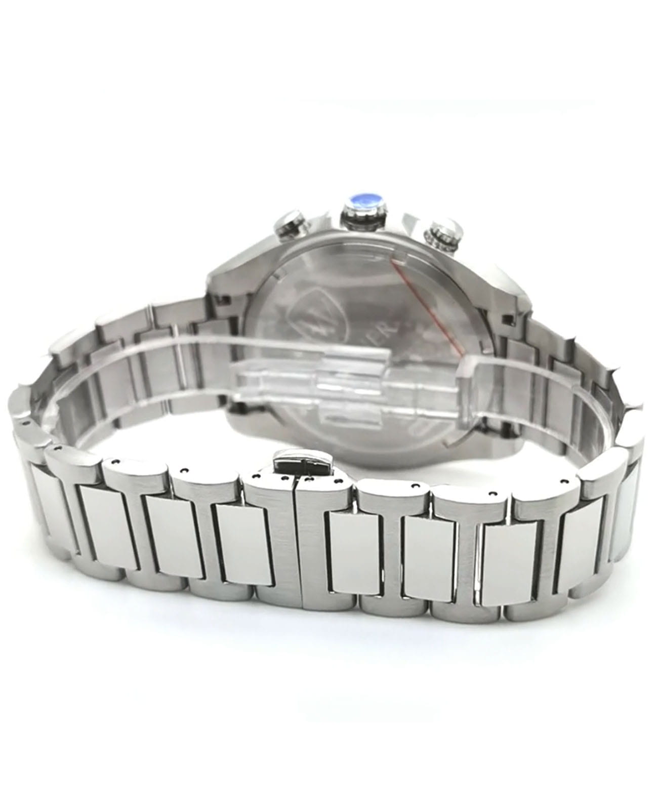 Мужские наручные часы-хронографХронографФункция позволяет измерять отрезки времени с особой точностью: часы, минуты, секунды. Верным признаком хронографа является наличие на циферблате 3 дополнительных окошек-счётчиков. WA.19300-C с надежным кварцевым механизмом. Корпус часов изготовлен из нержавеющей стали 316L. Стальной браслет на застёжке-бабочке с кнопкамиЗастёжка "бабочка"Такой вид застёжки дополняется предохранителями, помогающими избежать случайного раскрытия браслета. Обладают изящным исполнением. . Окошко даты находится в между 4 и 5 часами. Сапфировое стеклоСапфировое стеклоПрочный и надёжный материал из кристалла сапфира синтетического происхождения, характеризующийся особой твёрдостью и устойчивостью к царапинам и повреждениям.. Уровень водозащиты: 100 метров, позволит плавать, нырять и заниматься другими водными видами спорта. 12 и 24-часовой формат времени. БезельБезельВнешний ободок, закрепляющий стекло. В спортивных часах так называется поворотное кольцо с делениями на циферблате, выполняет роль таймера – замеряет отрезки времени на шкале. Неподвижный безель – элемент декора. Однонаправленно вращающийся безель на дайверских часах позволяет фиксировать моменты погружения и выныривания на поверхность. с PVD-покрытиемPVDУльтратонкое покрытие наносится в технике вакуумного напыления, сочетает в себе нитрид титана особой прочности со слоем золота или оксида хрома. Несёт в себе декоративную или защитную функцию.. Стрелки с люминесцентным покрытиемЛюминесцентное покрытиеПозволяет считывать показания времени в темноте. Производители наносят на стрелки, часовые индексы, безель или поверхность циферблата светонакопительный состав, дающий холодное свечение..