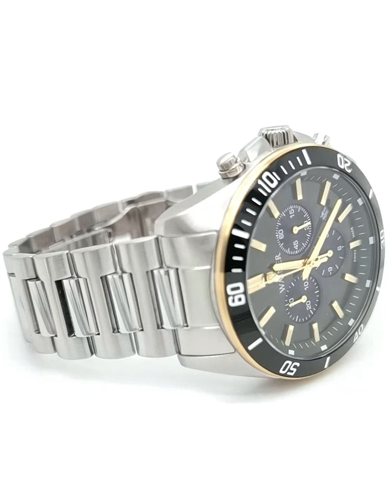 Мужские наручные часы-хронограф WA.19540-B с надежным кварцевым механизмом. Корпус часов изготовлен из нержавеющей стали 316L. Стальной браслет на застёжке-бабочке с кнопкамиЗастёжка "бабочка"Такой вид застёжки дополняется предохранителями, помогающими избежать случайного раскрытия браслета. Обладают изящным исполнением. . Окошко даты находится в между 4 и 5 часами. Сапфировое стеклоСапфировое стеклоПрочный и надёжный материал из кристалла сапфира синтетического происхождения, характеризующийся особой твёрдостью и устойчивостью к царапинам и повреждениям.. Уровень водозащиты: 100 метров, позволит плавать, нырять и заниматься другими водными видами спорта. 12 и 24-часовой формат времени. Вращающийся безельБезельВнешний ободок, закрепляющий стекло. В спортивных часах так называется поворотное кольцо с делениями на циферблате, выполняет роль таймера – замеряет отрезки времени на шкале. Неподвижный безель – элемент декора. Однонаправленно вращающийся безель на дайверских часах позволяет фиксировать моменты погружения и выныривания на поверхность. с PVD-покрытиемPVDУльтратонкое покрытие наносится в технике вакуумного напыления, сочетает в себе нитрид титана особой прочности со слоем золота или оксида хрома. Несёт в себе декоративную или защитную функцию.. Стрелки с люминесцентным покрытиемЛюминесцентное покрытиеПозволяет считывать показания времени в темноте. Производители наносят на стрелки, часовые индексы, безель или поверхность циферблата светонакопительный состав, дающий холодное свечение..