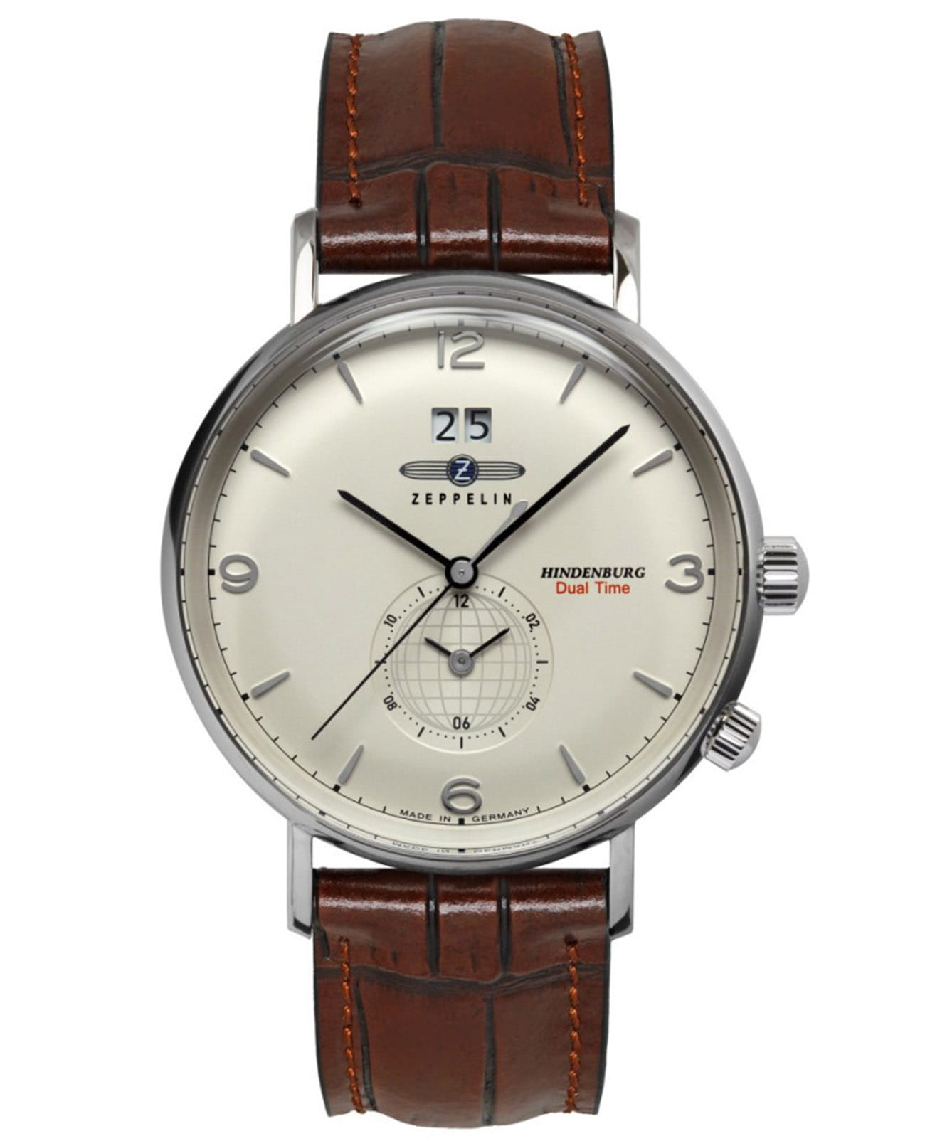 Мужские кварцевые часы Zeppelin Hindenburg — это безупречный и лаконичный аксессуар. Корпус диаметром 41 мм и толщиной 11 мм выполнен из нержавеющей стали с полированной отделкой. Циферблат белого цвета оформлен индексами и стрелками. Окошко даты расположено в положении 12 часов. Присутствует функция второго часового пояса (GMTВторой часовой поясФункция, позволяющая отображать время двух часовых поясов одновременно.). Циферблат защищён минеральным стекломМинеральное стеклоМинеральное стекло представляет собой искусственно выращенный минерал кварца. Такое стекло отличается особой устойчивостью к повреждениям и царапинам. Уступает по некоторым качествам сапфировому стеклу.. Часы оснащены коричневым кожаным ремешком на классической пряжке. Водонепроницаемость 50 м позволяет использовать часы в повседневных условиях. Идеальный выбор для тех, кто ценит немецкое качество и универсальный дизайн.